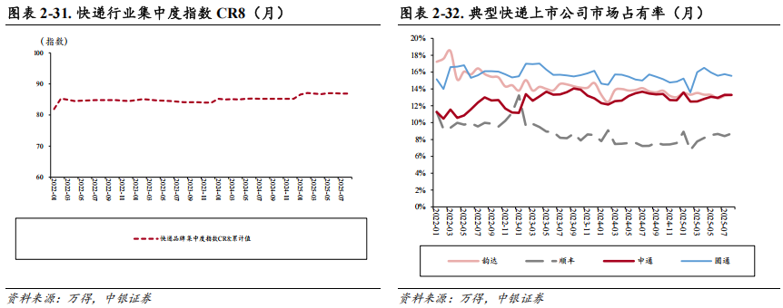 2025年8月快递业品牌集中度指数CR8为86.90。2025年8月,快递与包裹服务品牌集中度指数CR8为86.90,同比增长2.00%,环比与7月持平。