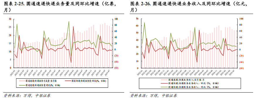 圆通速递:2025年8月快递业务量25.11亿票,同比上升11.06%,环比下降2.79%,业务收入53.90亿元,同比上升9.82%,环比上升0.35%。