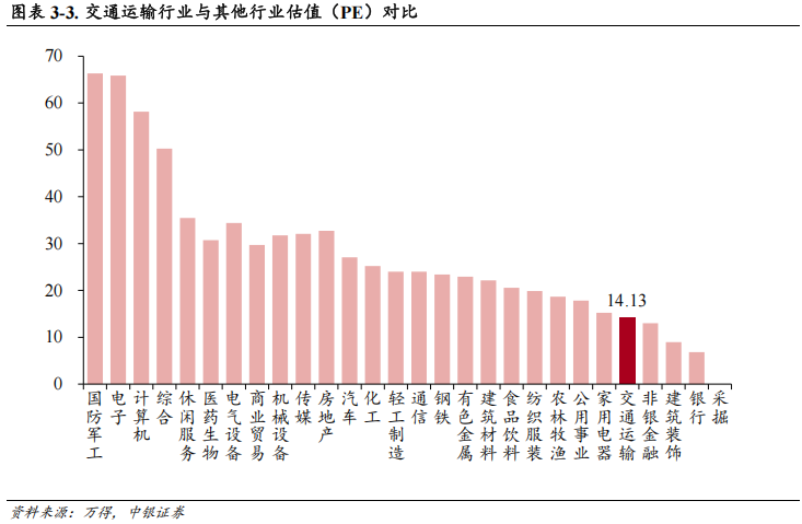 在市场28个一级行业中,交通运输行业的市盈率为14.13倍(2025.9.26),处于偏下的水平。