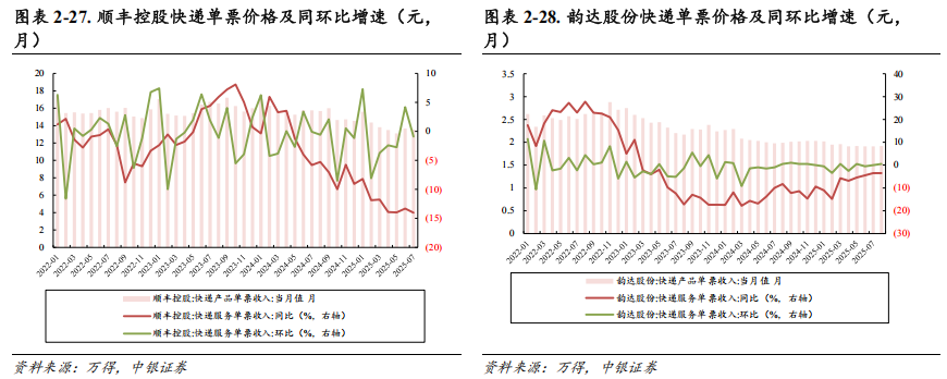 顺丰控股:2025年8月单票价格13.27元,同比-15.32%(-2.40元),环比-2.07%(-0.28元)。