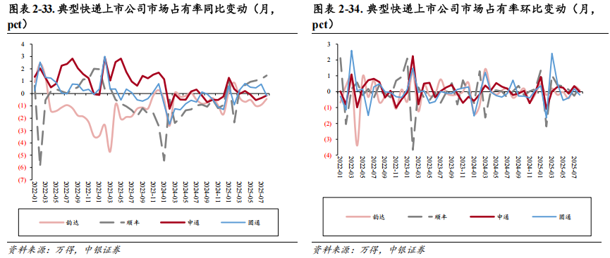 申通快递:8月申通的市占率为13.29%,同比-0.17pct,环比与7月持平。