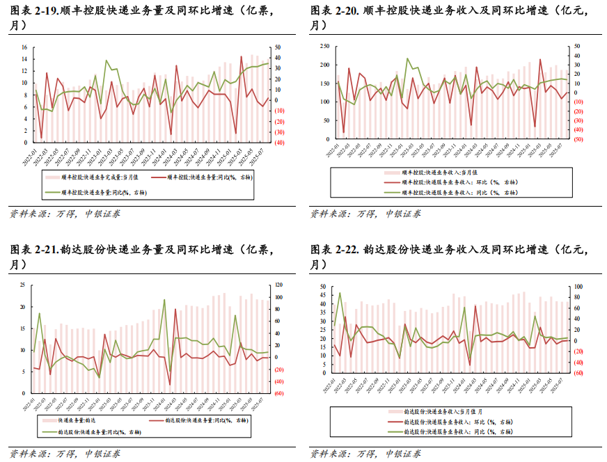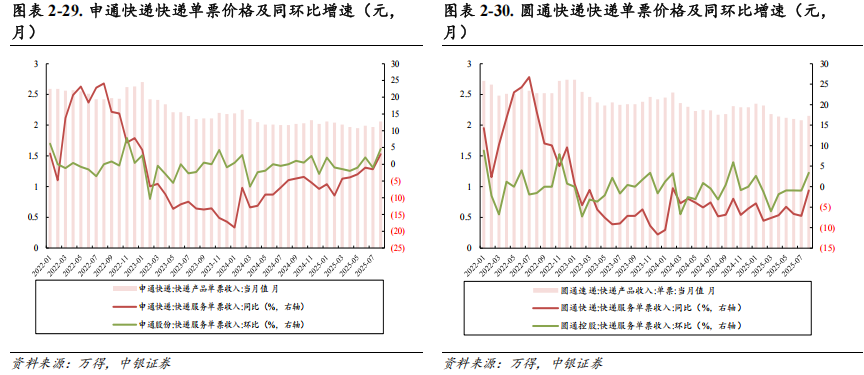 圆通速递:2025年8月单票价格2.15元,同比-0.92%(-0.02元),环比+3.37%(+0.07元)。