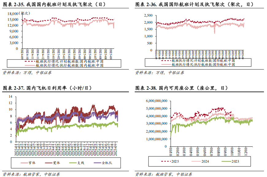 2025年8月吉祥、春秋、国航、南航、东航、海航ASK已超19年同期。可用座公里(ASK)方面,2025年8月,南航、国航、东航可用座公里分别相对去年同比增长6.22%、2.28%、6.76%,恢复至19年同期的112.06%、128.07%、119.60%;吉祥、春秋、海航8月可用座公里恢复至19年同期的140.23%、142.68%、89.00%,部分航司已远超疫情前水平。收入客公里(RPK)方面,南航、国航、海航、吉祥8月收入客公里分别同比+0.80%、+5.97%、+3.23%、+3.05%,南航、国航、海航、吉祥已恢复至19年同期的103.29%、175.62%、239.53%、186.52%。