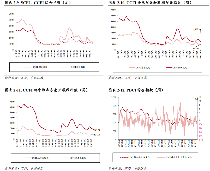 集运:SCFI指数报收1114.52点,运价下降。2025年9月26日,上海出口集装箱运价指数(SCFI)报收1114.52点,周环比-6.98%,同比-47.80%;2025年9月26日,中国出口集装箱运价指数(CCFI)报收1087.41点,周环比-2.93%,同比-33.63%,分航线看,美东航线、欧洲航线、地中海航线、东南亚航线周环比0.49%/-4.69%/-5.63%/-1.19%,同比-28.58%/-44.35%/-39.82%/-19.78%。