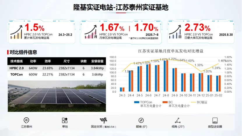 隆基泰州基地的实证电站通过一年的实证数据显示,“三防”组件比TOPCon累计单瓦发电增益高1.5%,单日最大单瓦发电增益高2.73%。
