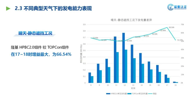 在晴天有遮挡工况下,隆基HPBC2.0组件较TOPCon组件在17~18时增益最大,为66.54%。