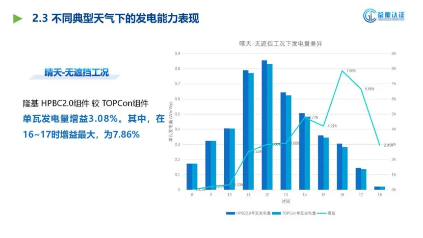 在晴天无遮挡工况下,隆基HPBC2.0组件较 TOPCon组件单瓦发电量增益3.08%。其中,在16~17时增益最大,为7.86%。