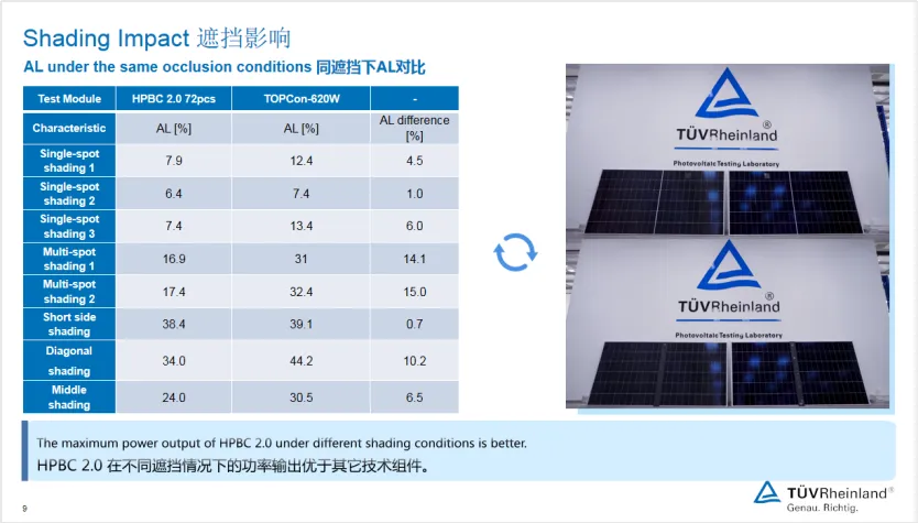 TÜV莱茵的数据证明,采用 HPBC 2.0 技术的隆基“三防”组件无论在单点遮挡、多点遮挡、斜边遮挡的情况下,功率损失均优于 TOPCon 组件,因此隆基 HPBC 2.0 的组件获得了莱茵抗阴影 A + 级认证。