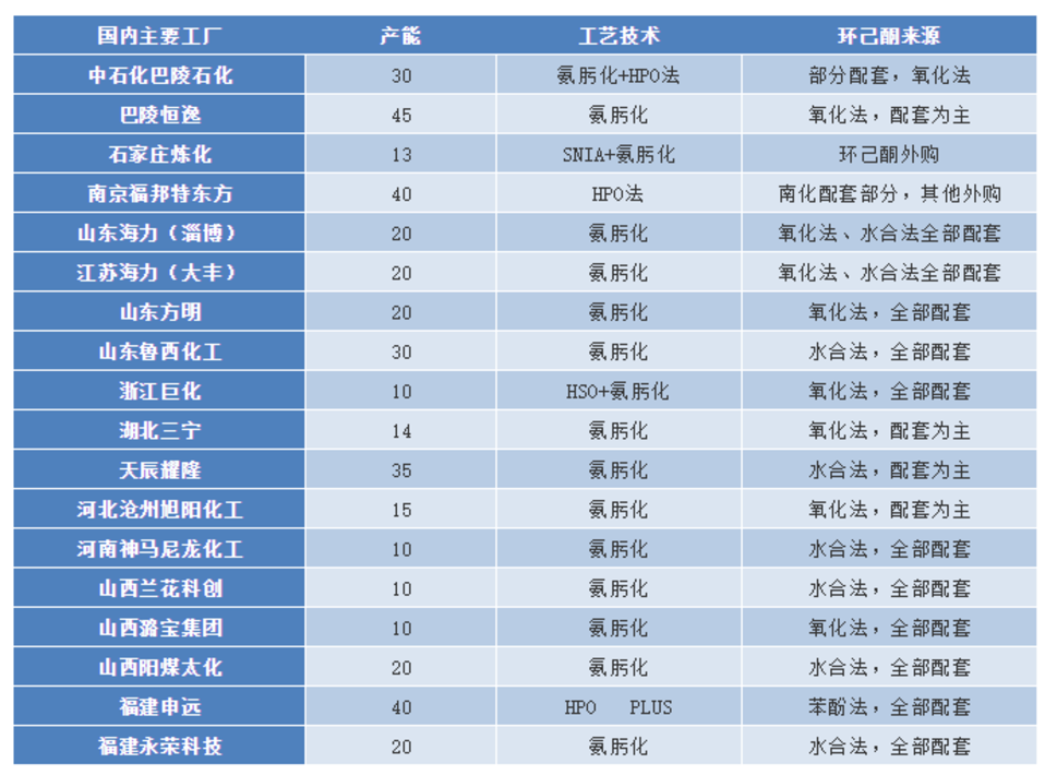 我国主要生产企业包括中石化、旭阳集团、福建申远新材料、平煤神马、恒申集团、华鲁恒升、兖矿能源、巨化集团、兰花科技、海力集团、鲁西化工、永荣科技等。
