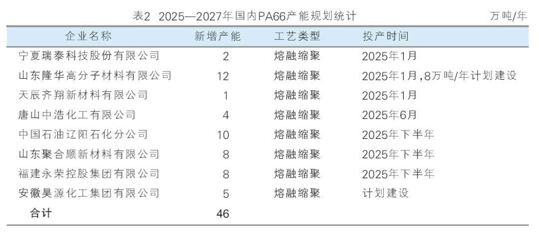 从产能来看,2025—2027年,国内PA66产业将迎来新一轮扩张周期,在建产能合计达46万吨/年。进度方面,2025年上半年已有7万吨/年产能落地,其中唐山中浩4万吨/年装置于6月完成投料。
