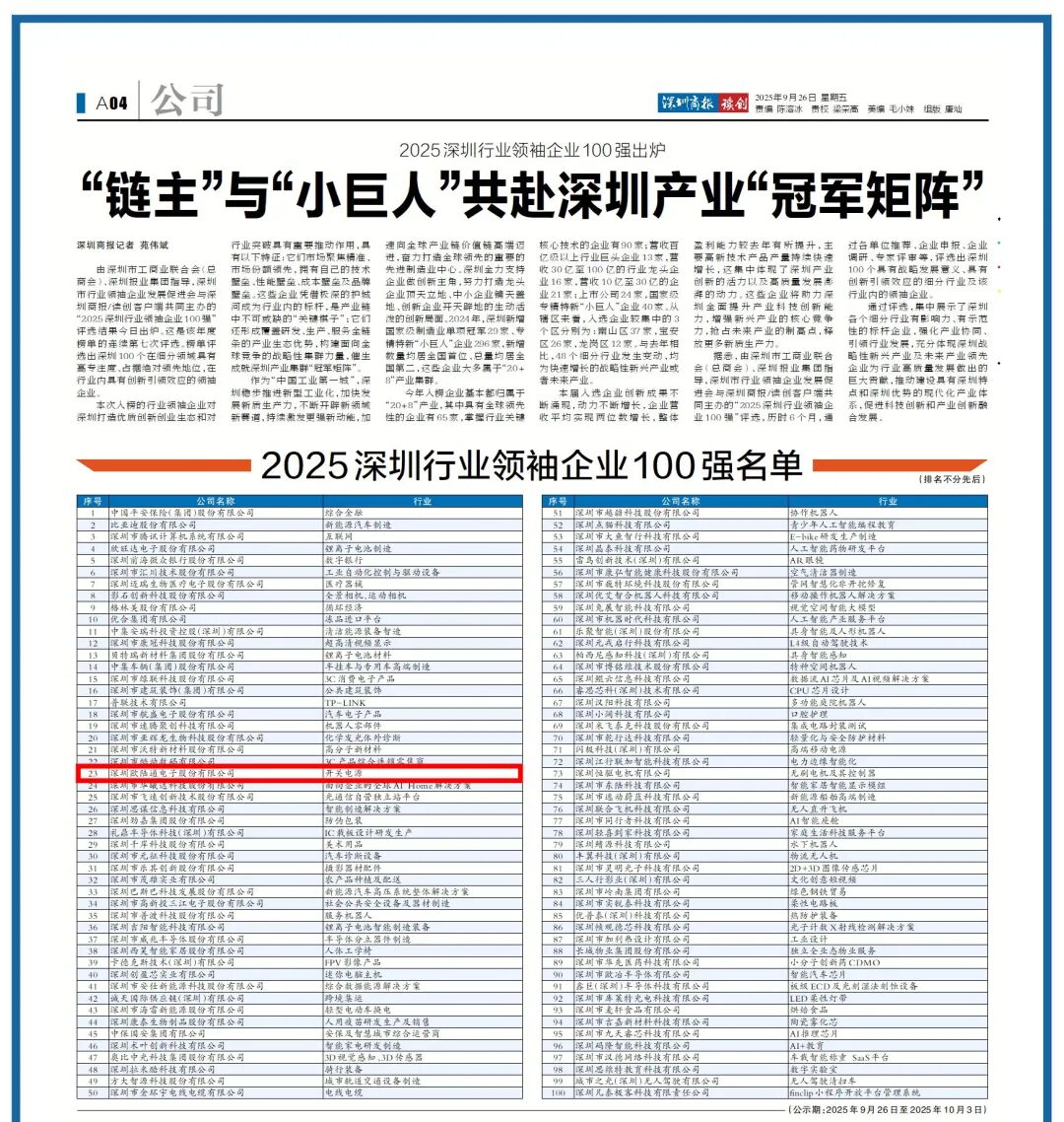“2025深圳行业领袖企业100强”评选,历时6个月,通过各单位推荐、企业申报、企业调研、专家评审等,评选出深圳100个具有战略发展意义、具有创新引领效应的细分行业及该行业内的领袖企业。
