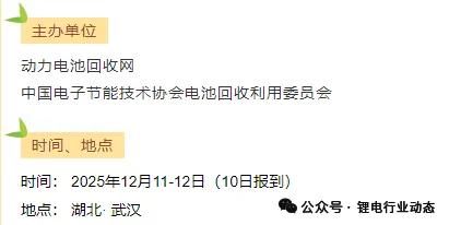 “2025中国动力电池回收利用行业回收年会暨新型、高效提锂技术发展论坛”将于12月11-12日在武汉举办,规模:500+,大会主题:绿色循环·高效提锂。
