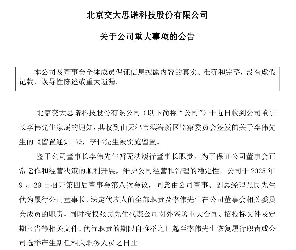 9月30日,交大思诺(300851.SZ,股价27.23元,市值23.67亿元)公告称,公司董事长李伟被天津市滨海新区监察委员会实施留置,暂无法履行董事长职责。