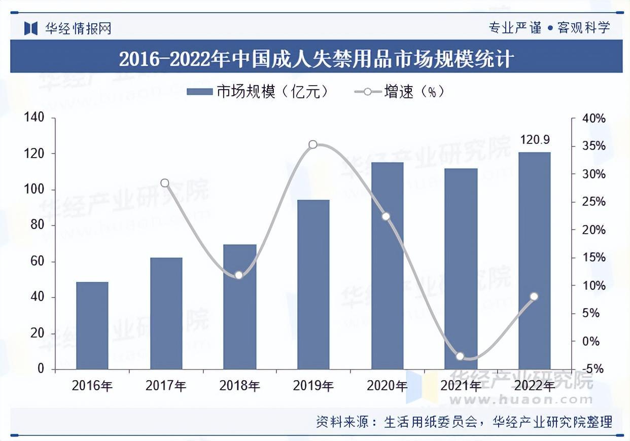 2016年-2022年,我国成人失禁用品市场规模复合年均增长率为13.8%。2022年我国成人失禁用品市场规模120.9亿元,较2021年增长7.9%。受益于老龄化趋势延续以及消费观念的不断转变,未来成人失禁用品市场规模有望继续保持快速发展。