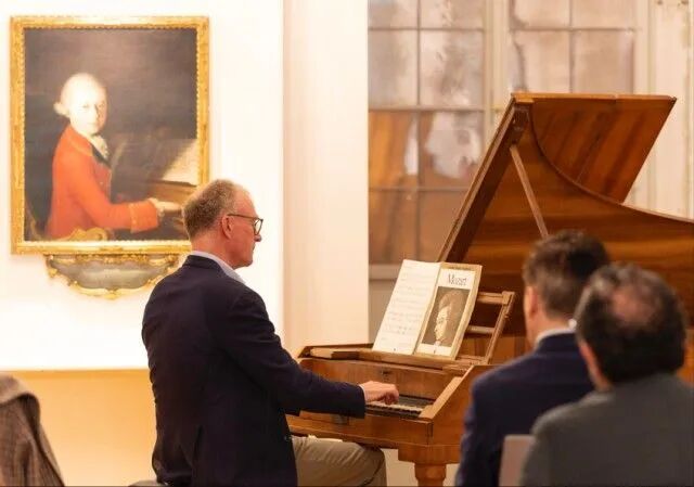 除庆典音乐会外,本次活动还进行了“地标文化之旅”系列演出。国际莫扎特基金会主席带领嘉宾参观了莫扎特故居,一同鉴赏了莫扎特的亲笔手稿与书信。随后,他奏响了莫扎特 1785 年收藏的击弦古钢琴,以沉浸式的演奏,让在场嘉宾近距离感受音乐遗产的独特魅力。