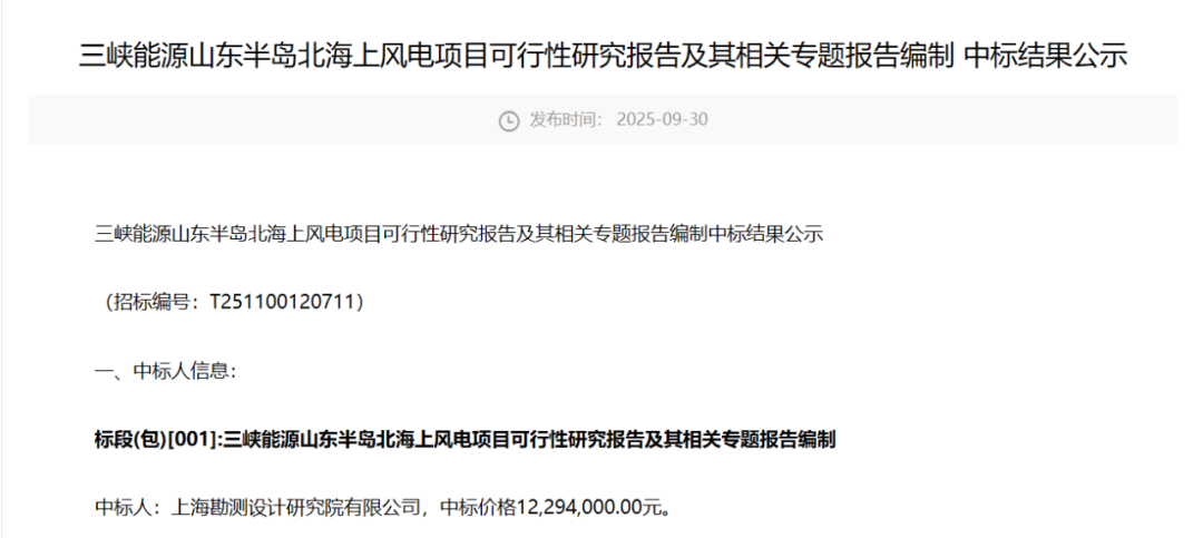 9月30日,中国三峡电子采购平台发布《三峡能源山东半岛北海上风电项目可行性研究报告及其相关专题报告编制中标结果公示》的公告。