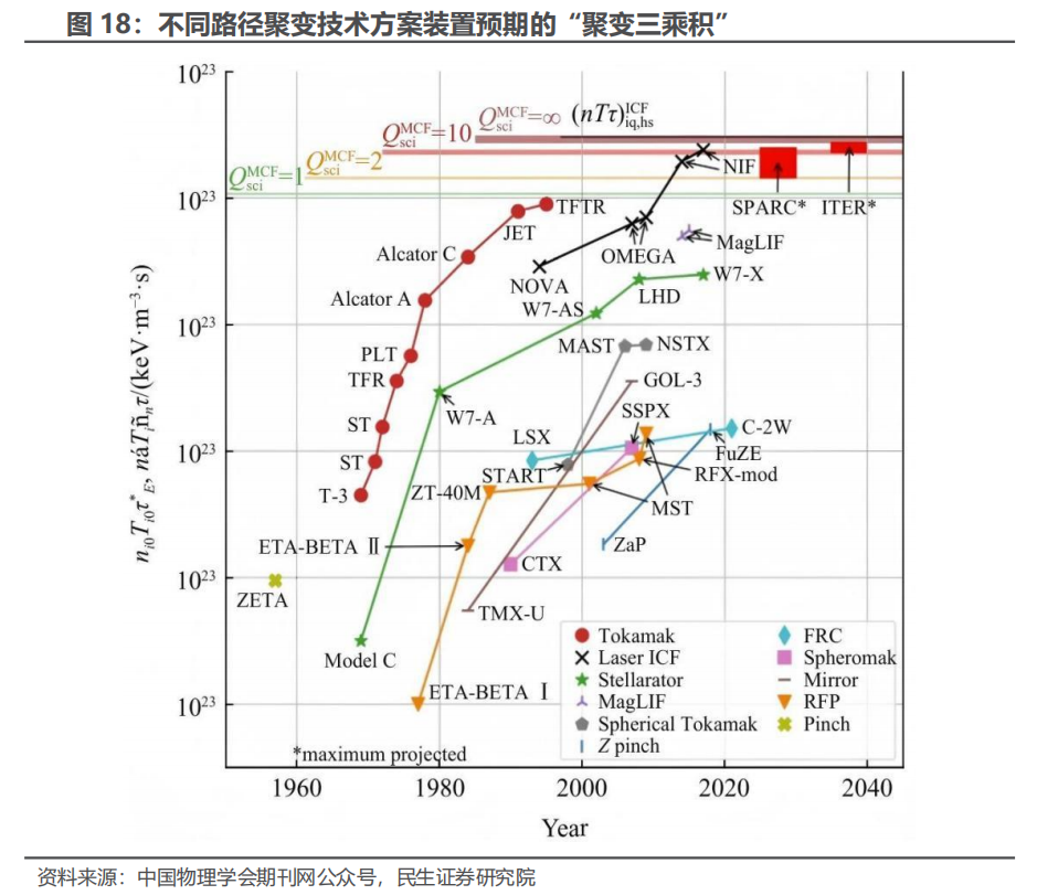 ■ 核聚变:人类能源问题的终极解决方案。可控核聚变是指在受控环境下,通过科学技术手段模拟太阳的核聚变原理产生能量,其核心在于使氢的同位素氘和氚结合释放能量,因此成为大众口中的“人造太阳”。实现核聚变反应,需要同时满足三个条件:足够高的温度(T)、一定的密度(n)和一定的能量约束时间(τE),三者的乘积称为聚变三乘积。近年来,中国可控核聚变逐渐开启了商业化道路,民营企业和民间资本陆续进入聚变能源这条赛道。
