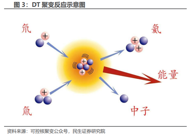 氘氚聚变是当前最主要的核聚变反应形式。根据Fusion Industry Association统计,目前核聚变反应中原料来源中,氘氚聚变反应占比为65%,是当前最主要的核聚变反应形式。氘氚聚变反应是当一个氘核与一个氚核聚在一起,在高温等条件下发生反应,形成一个新的原子核-氦,同时释放出1个中子,反应过程中减少的质量变成了大约17.6MeV的能量。氘氚反应速率高且反应横截面较大,同时原材料氘容易获取。