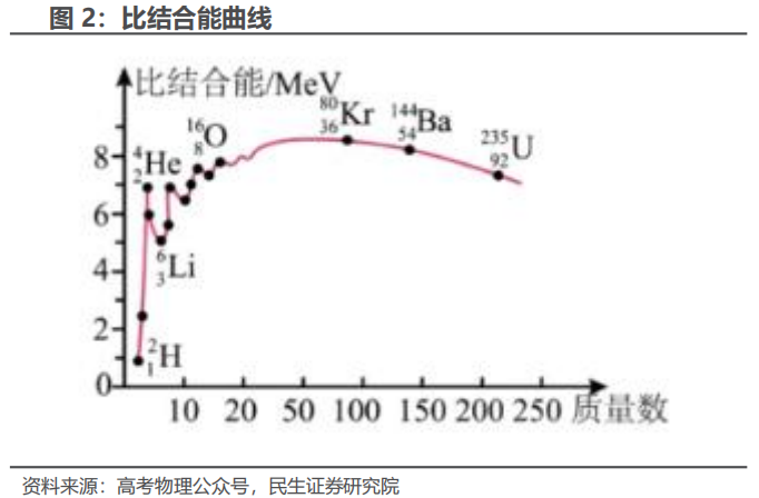 根据比结合能曲线图,原子核的比结合能(单位核子的结合能)随原子核质量数的变化呈抛物线形。轻核偏低、重核偏低,随着比结合能越来越高核越来越稳定,因此有两个方向的核反应可以释放能量:1、轻核通过聚变成中等质量核;2、重核通过裂变成中等质量核。
