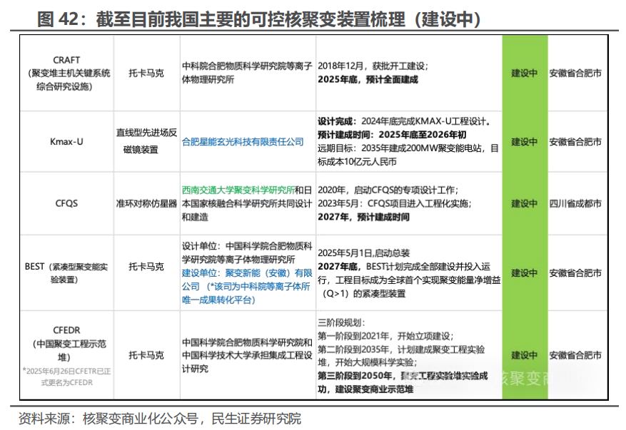 ■等离子体所系:技术发展脉络呈现国家队主导并带动产业化主体发展:HT-7(建成于1994年,目前已退役)→EAST(建成于2006年)→CRAFT“夸父”(预计2025年底建成)→BEST(等离子体所与其孵化企业合肥聚变新能主导建设,预计2027年底建成)→CFEDR(等离子体所与合肥聚变新能主导建设,该项目近期被正式定位为聚变示范堆,官方名称也由CFETR更新为CFEDR,标志着其从实验堆向示范堆的战略升级)。
