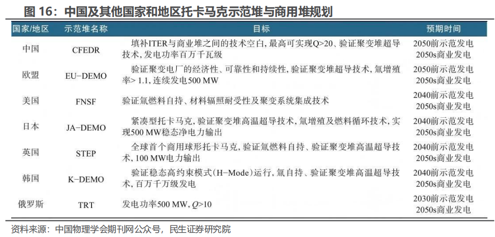 示范发电堆建设是连接实验堆和商用堆的关键环节。示范堆旨在验证托卡马克聚变能发电的工程可行性,为后续商用堆的设计和建造奠定基础。下方图表给出了世界主要国家和地区托卡马克型聚变示范堆及商业化发电规划。若关键技术得以突破,核聚变有望在21世纪下半叶成为基荷能源,重塑全球能源格局。