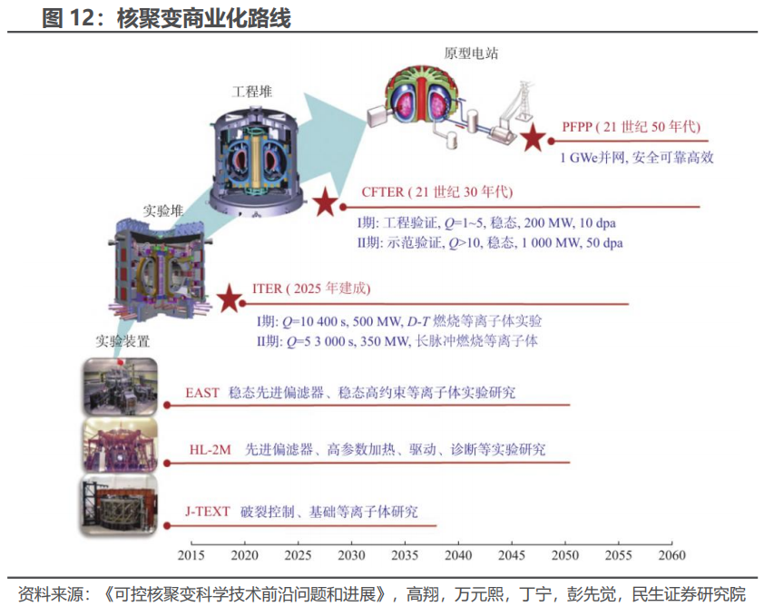 聚变能商业化的发展将沿着聚变实验堆(如正在建造的ITER)、示范发电堆(DEMO)和聚变能商业化应用3个阶段推进。
