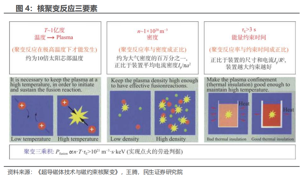 实现核聚变反应,需要同时满足三个条件:足够高的温度(T)、一定的密度(n)和一定的能量约束时间(τE),三者的乘积称为聚变三乘积。根据劳逊判据,只有聚变三乘积大于一定值(5×10^21m^−3·s·keV),才能产生有效的聚变功率输出。