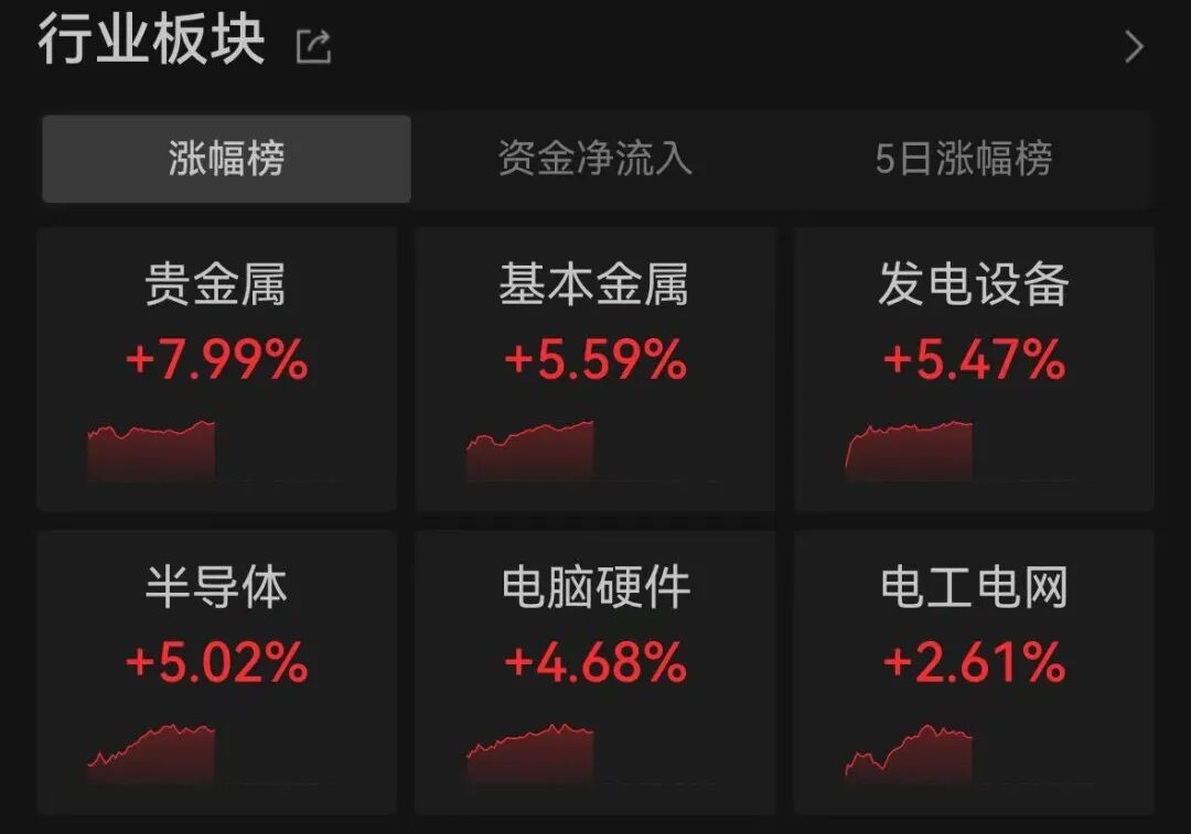 来源:Wind,下同盘面上,贵金属、有色金属、半导体、钢铁、电力等板块大涨,可控核聚变、超导、存储芯片等概念股飙升。