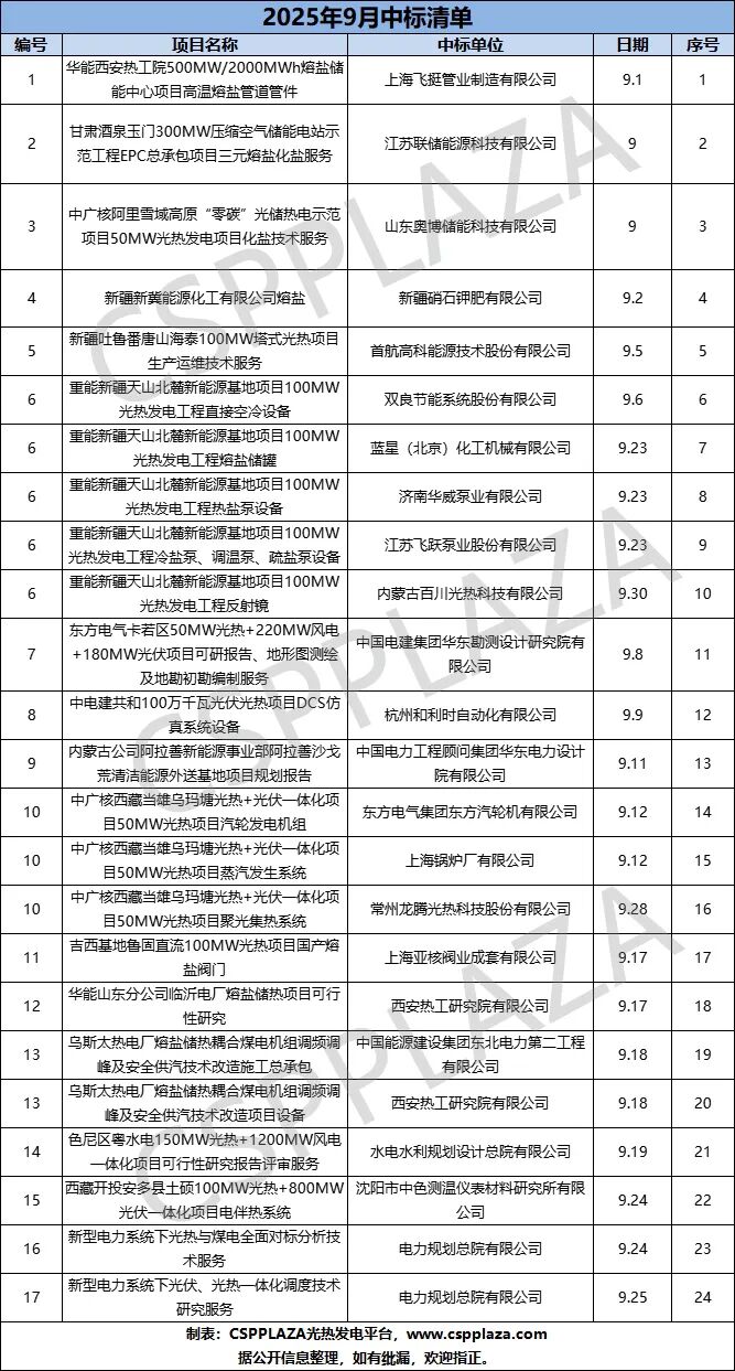 据CSPPLAZA不完全统计,2025年9月已有17个光热/熔盐储能相关项目共计24个重要标的完成招标,具体如下: