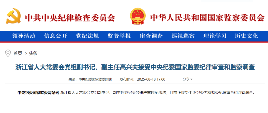 中央纪委国家监委网站8月18日消息,浙江省人大常委会党组副书记、副主任高兴夫涉嫌严重违纪违法,目前正接受中央纪委国家监委纪律审查和监察调查。