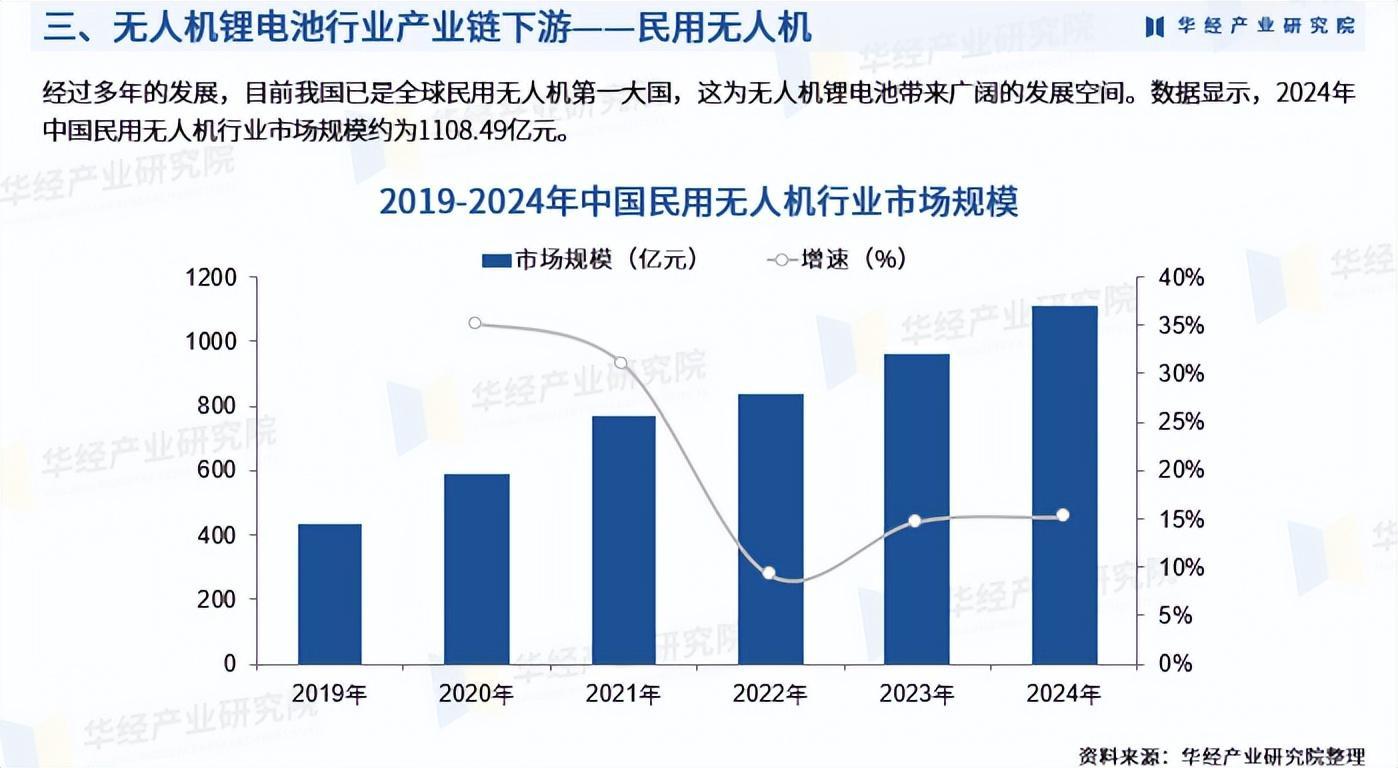 经过多年的发展,目前我国已是全球民用无人机第一大国,这为无人机锂电池带来广阔的发展空间。数据显示,2024年中国民用无人机行业市场规模约为1108.49亿元。