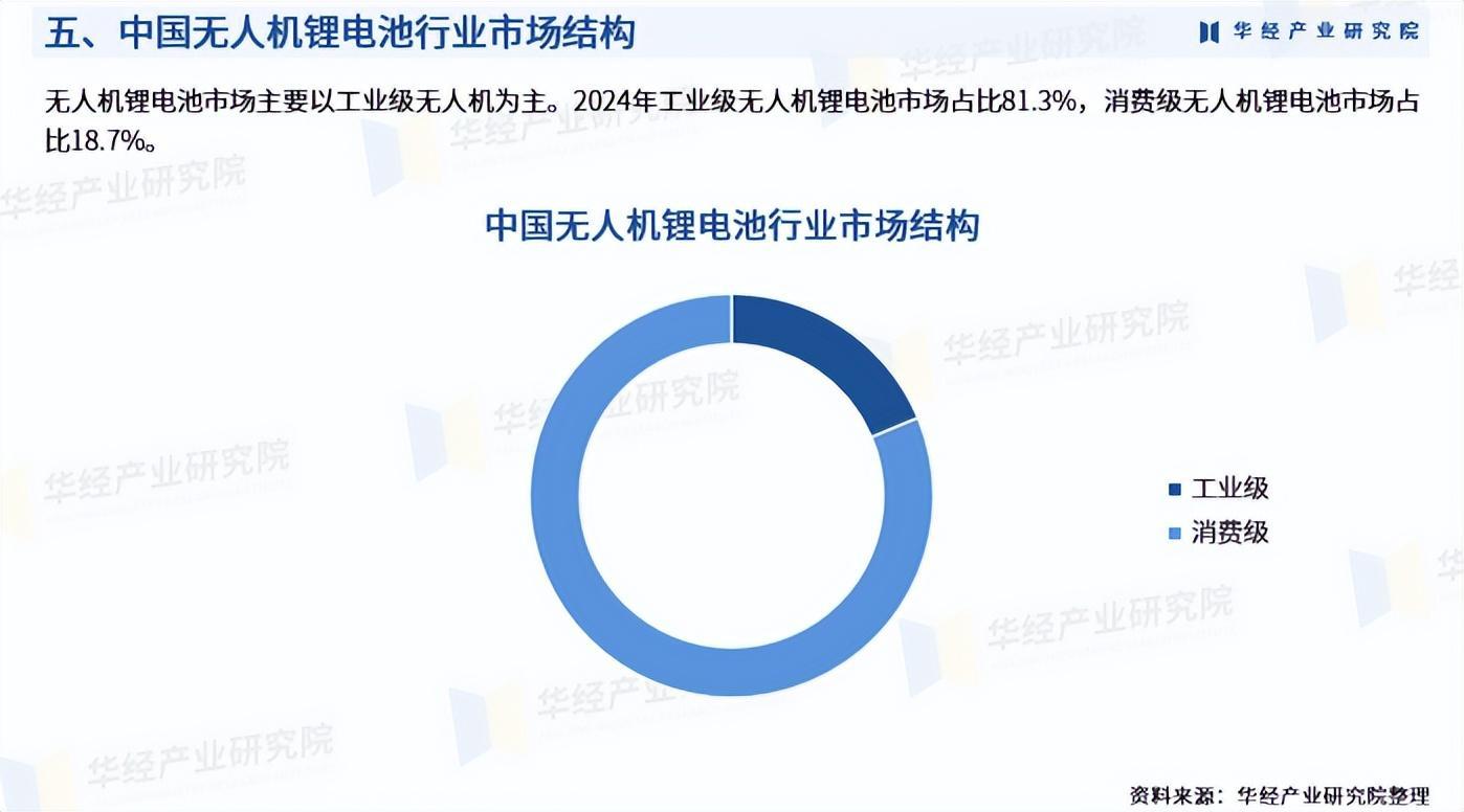无人机锂电池市场主要以工业级无人机为主。2024年工业级无人机锂电池市场占比81.3%,消费级无人机锂电池市场占比18.7%。