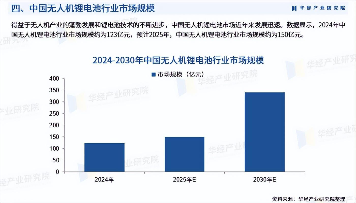 得益于无人机产业的蓬勃发展和锂电池技术的不断进步,中国无人机锂电池市场近年来发展迅速。数据显示,2024年中国无人机锂电池行业市场规模约为123亿元,预计2025年,中国无人机锂电池行业市场规模约为150亿元。