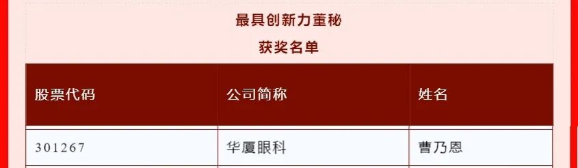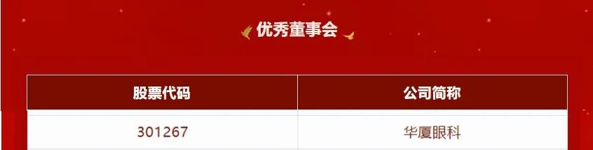 近日,由《董事会》杂志主办的第20届中国上市公司董事会“金圆桌奖”评选结果重磅揭晓,华厦眼科再获两项殊荣!其中,华厦眼科董事会荣获“优秀董事会”,董事会秘书曹乃恩先生荣获“最具创新力董秘”!