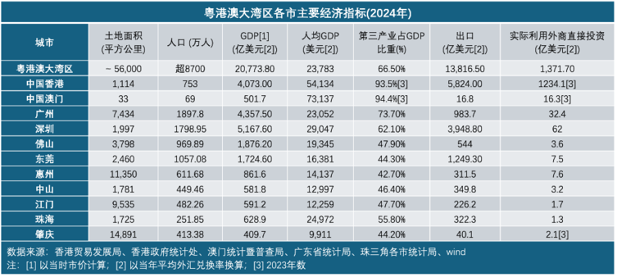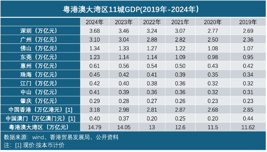 基于技术、人才、资金等发展要素的快速流动,《粤港澳大湾区蓝皮书:粤港澳大湾区建设报告(2025)》显示,2024年粤港澳大湾区以14.79万亿元的经济总量,超越了纽约和旧金山两个世界级湾区,与东京湾区并列全球经济规模第一梯队,人均GDP估算约17.02万元。