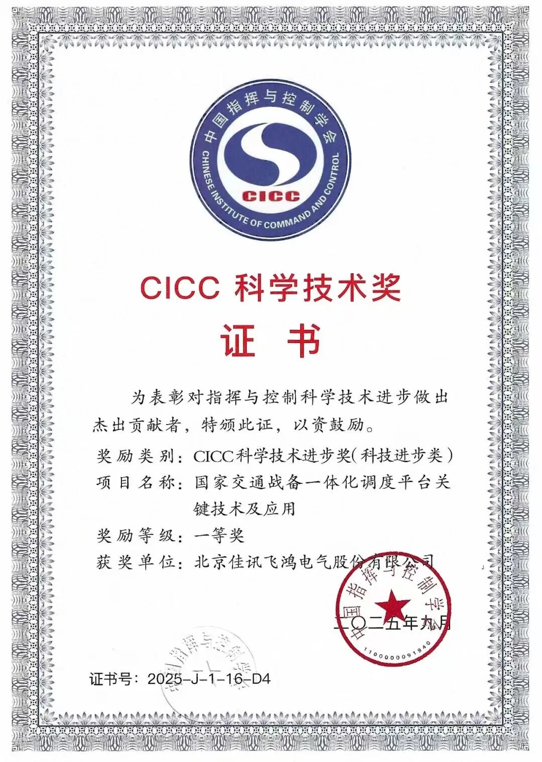 此次获奖,不仅是中国指挥与控制学会(以下简称“CICC”)对佳讯飞鸿技术创新实力的权威认证,更是对公司公专网融合应急通信解决方案在重大项目中的应用价值与先进性的充分认可与肯定。