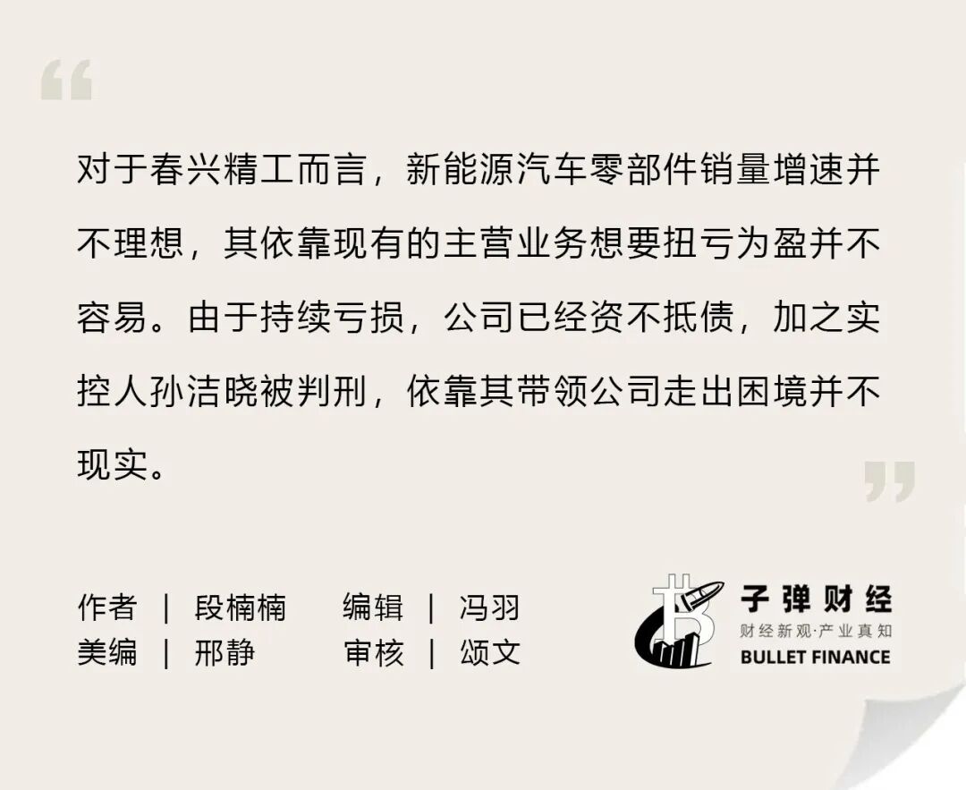 对于春兴精工而言,新能源汽车零部件销量增速并不理想,其依靠现有的主营业务想要扭亏为盈并不容易。由于持续亏损,公司已经资不抵债,加之实控人孙洁晓被判刑,依靠其带领公司走出困境并不现实。