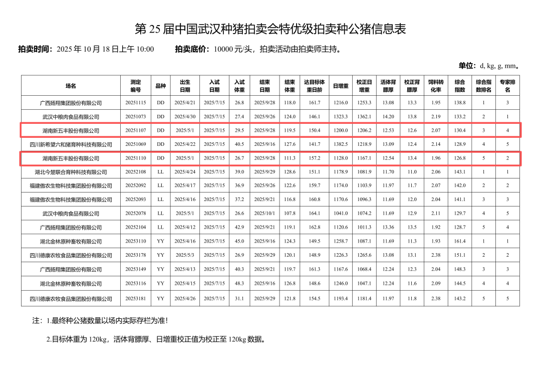 日前,2025年中国农民丰收节系列活动暨全国种猪大赛(湖北赛区)暨第25届中国武汉种猪测定成绩揭晓,由新五丰选送的两头杜洛克种公猪以“130.4和126.8的综合指数”强势突围,分别荣获专家排名第二、第四名次的优异成绩,成功彰显了新五丰在猪育种领域的强大实力。
