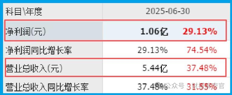 2025年中报显示,公司实现主营收入5.44亿元,同比增长37.48%;归母净利润1.06亿元,同比增长29.13%,保持了营收和净利润的双重高增长。