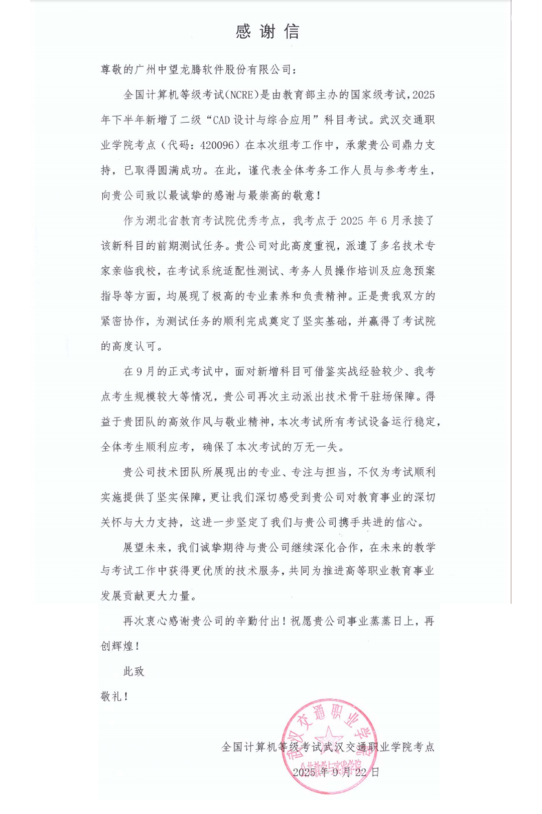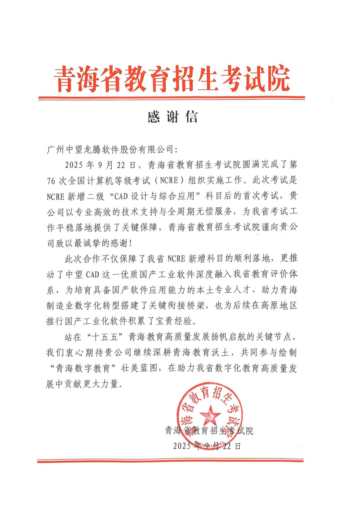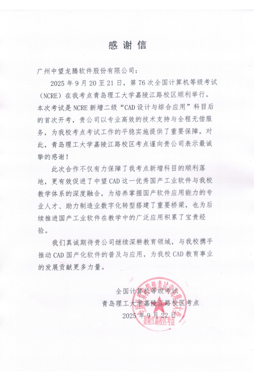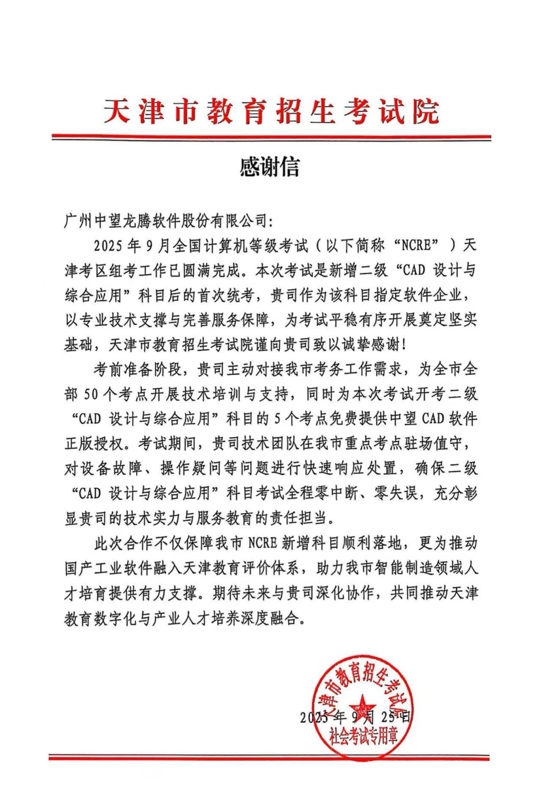 考试结束后,青海省、天津市等多地教育考试院及考点院校向中望软件发来感谢信,对专业、高效的技术支持与服务能力表示高度认可,这也是对中望CAD产品稳定性与服务教育事业的双重肯定。