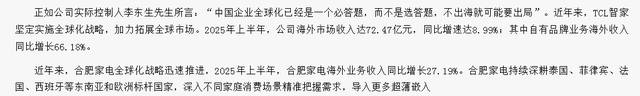 此外值得注意的是,2025年上半年,TCL智家持续拓展海外市场,海外业务收入达72.47亿元,同比增长8.99%。其中,海外自有品牌业务收入同比增长66.18%,合肥家电海外业务收入同比增长27.19%。