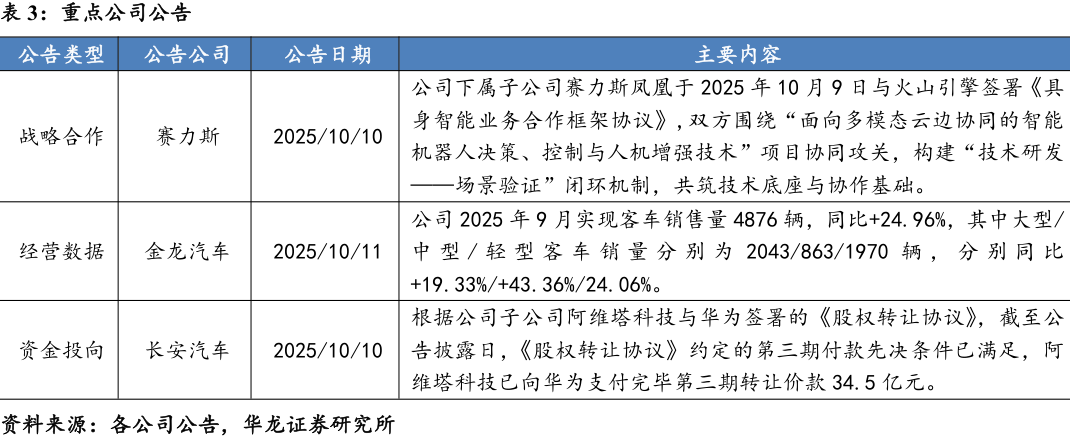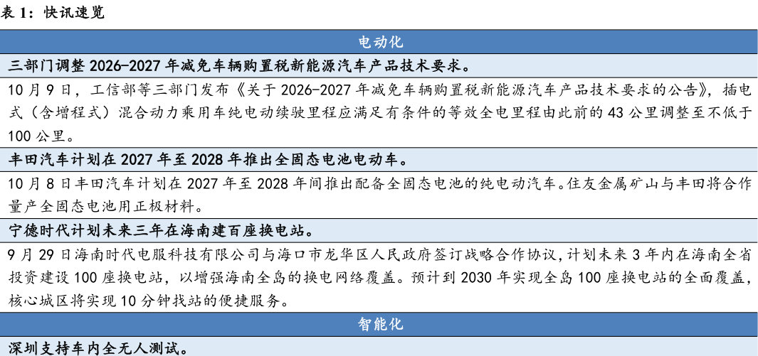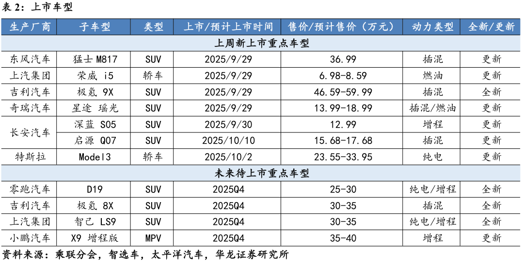 行业动态:行业要闻,一是多地暂停或调整汽车更新补贴;二是华为乾崑预计于2027年实现L3规模放量。上市车型,新款特斯拉Model3、长安汽车旗下启源Q07和吉利汽车旗下极氪9X等车型上市。