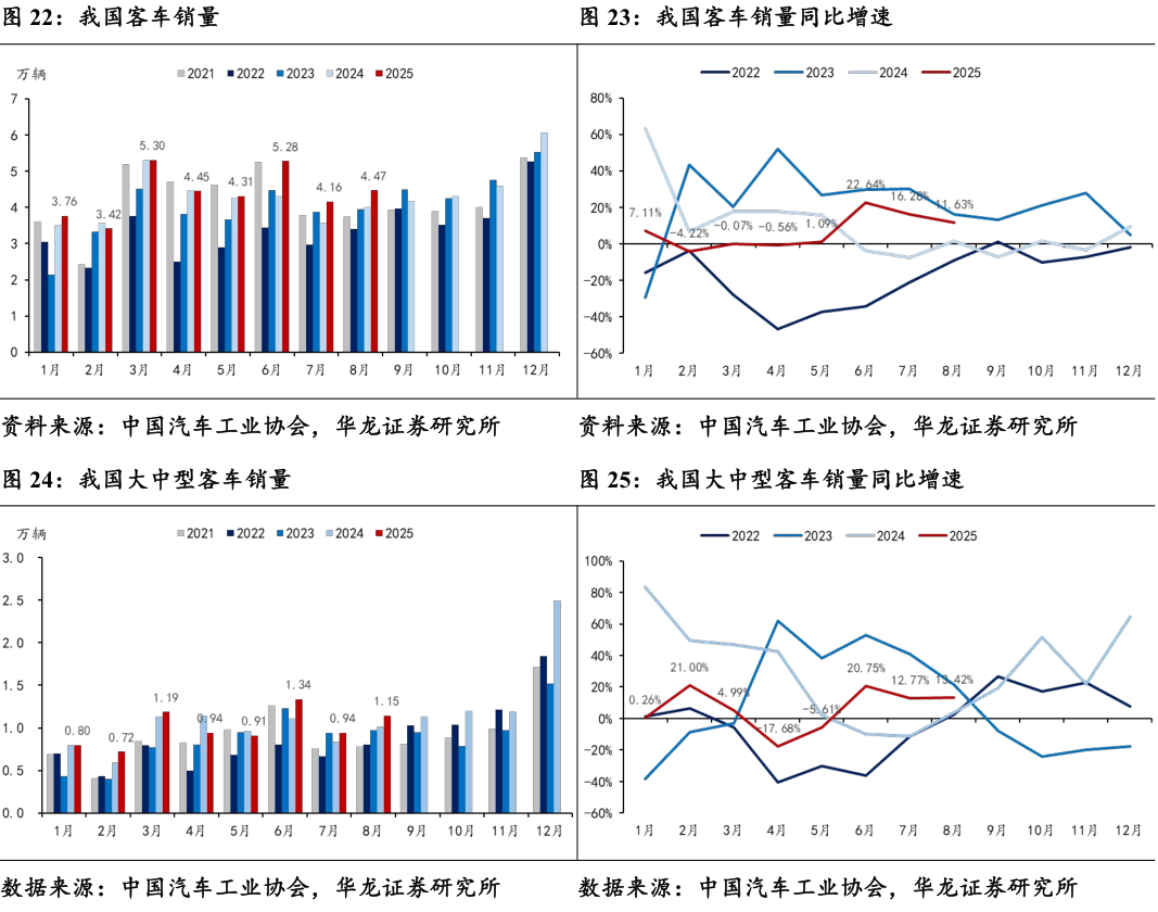 8月客车销量同比+11.63%。客车方面,据中汽协数据,2025年8月客车销量完成4.47万辆,同比+11.63%,环比+7.43%。2025年8月,大中型客车销量完成1.15万辆,同比+13.42%,环比+21.34%。客车销量环比实现止跌回升。