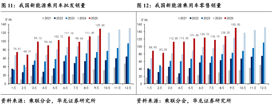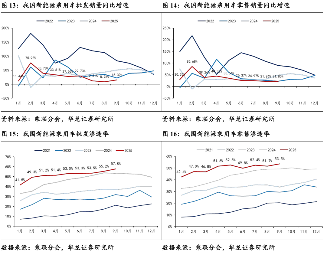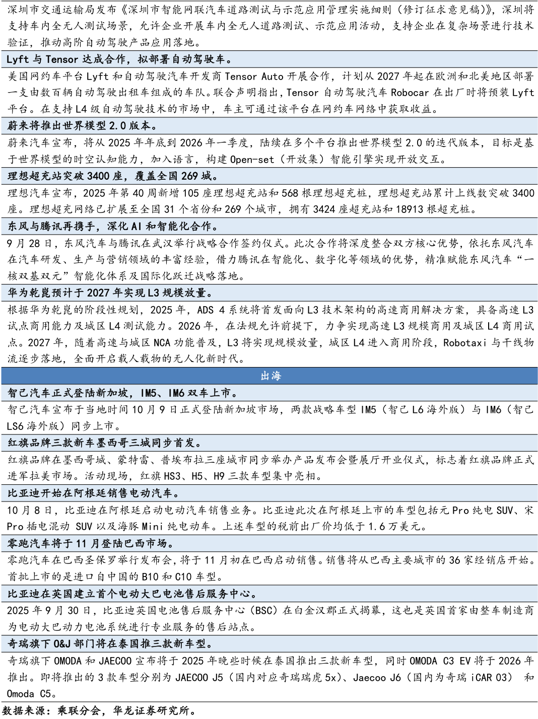 数据跟踪:月度数据,2025年9月,乘用车零售销量完成224.10万辆,同比+6.38%,环比+11.02%;新能源乘用车零售销量完成129.60万辆,同比+15.39%,环比+16.24%,零售渗透率57.8%,同比+4.51pct,环比+2.60pct。2025年7月,我国L2.5及以上乘用车销量54.35万辆,渗透率28.74%。周度数据,9月28-30日,乘用车市场零售销量完成46.3万辆,同比+38%,较上月同期+7%,新能源车市场零售26.8万辆,同比+54%,较上月同期+17%,周度乘用车市场新能源零售渗透率57.9%。
