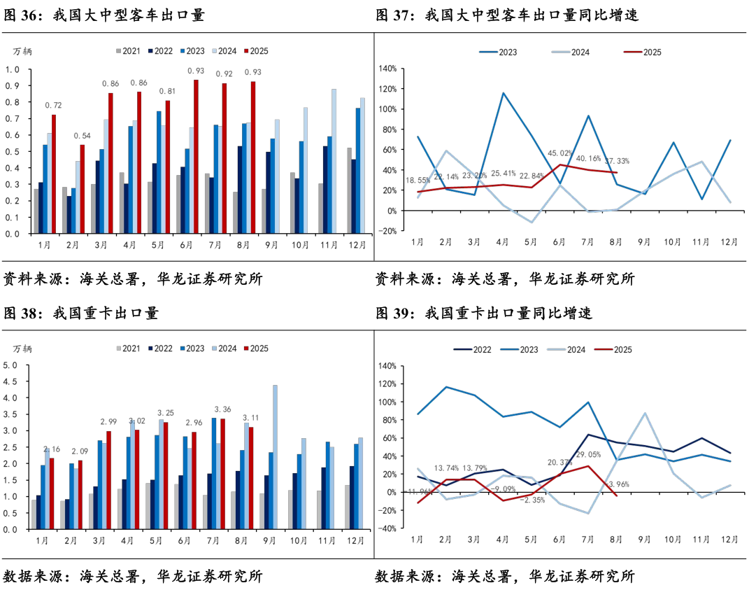 8月大中型客车出口量同比实现增长。据海关总署数据,2025年8月大中型客车出口销量完成0.93万辆,同比+37.33%,环比+1.06%;2025年8月重卡出口销量完成3.11万辆,同比-3.96%,环比-7.41%,同比下降主要系2024年同期基数较高。