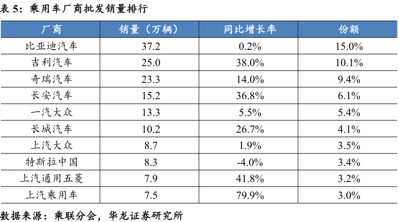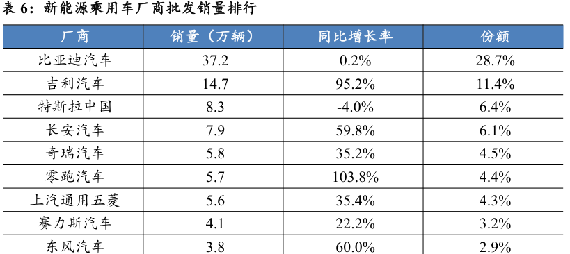 新能源销量前十位同比增速分化明显。分厂商来看,2025年8月,比亚迪汽车/吉利汽车/特斯拉中国分别以37.2/14.7/8.3万辆位居新能源乘用车厂商销量排名前三位。其中吉利汽车、零跑汽车和小鹏汽车在新车型的拉动作用下新能源销量同比高增。