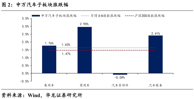 行业方面,本周(2025年9月29日至10月10日)申万汽车板块涨跌幅+0.43%,涨跌幅在31个行业中排名第22。细分板块中,乘用车板块涨跌幅+1.76%,商用车板块涨跌幅+2.95%,汽车零部件板块涨跌幅-0.09%,汽车服务板块涨跌幅+2.41%。同期沪深300涨跌幅+1.47%,万得全A涨跌幅+1.63%。