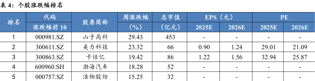 个股方面,本周153只个股上涨,134只个股下跌,涨跌幅前五的个股为山子高科(+29.43%),美力科技(+23.32%),卡倍亿(+19.42%),渤海汽车(+18.28%),浩物股份(+15.25%);涨跌幅后五的个股为美晨生态(-33.54%),明新旭腾(-17.09%),和谐汽车(-15.92%),新坐标(-12.57%),美东汽车(-12.31%)。