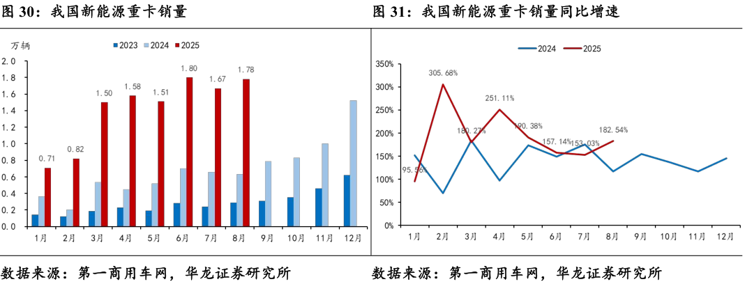 成本优势+补贴倾斜延续新能源重卡高景气度。据第一商用车网数据,2025年8月天然气重卡销量完成1.67万辆,同比+35.77%,环比+19.29%。随着各地天然气重卡以旧换新补贴细则逐步出台,叠加LNG价位仍维持低位运行、油气价差下天然气重卡长途运输经济性突显,天然气重卡销量有望维持高位。2025年8月新能源重卡销量完成1.78万辆,同比+182.54%,环比+6.59%,上游碳酸锂价格下降带动终端产品降价,叠加运营成本优势以及营运车辆补贴额度倾斜,新能源重卡景气度有望延续。