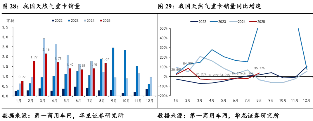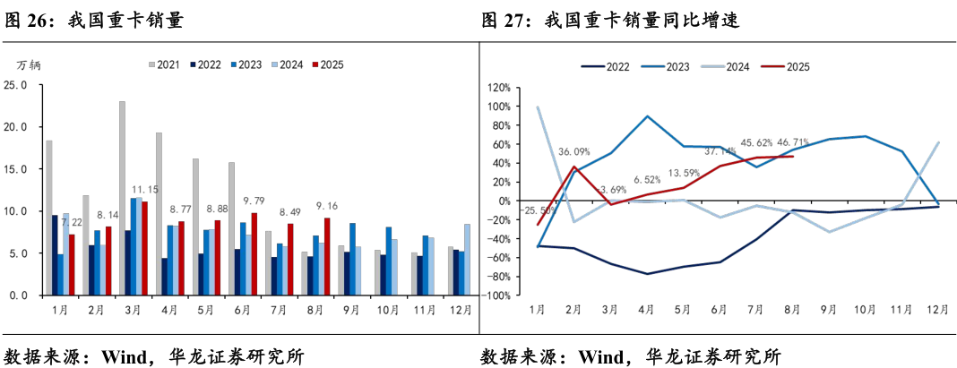 供需关系改善下重卡销量同比复苏。重卡方面,据Wind数据,2025年8月重卡销量完成9.16万辆,同比+46.71%,环比+7.93%。我们认为以旧换新补贴以及重卡供需关系改善拉动重卡销量同环比双双实现增长。